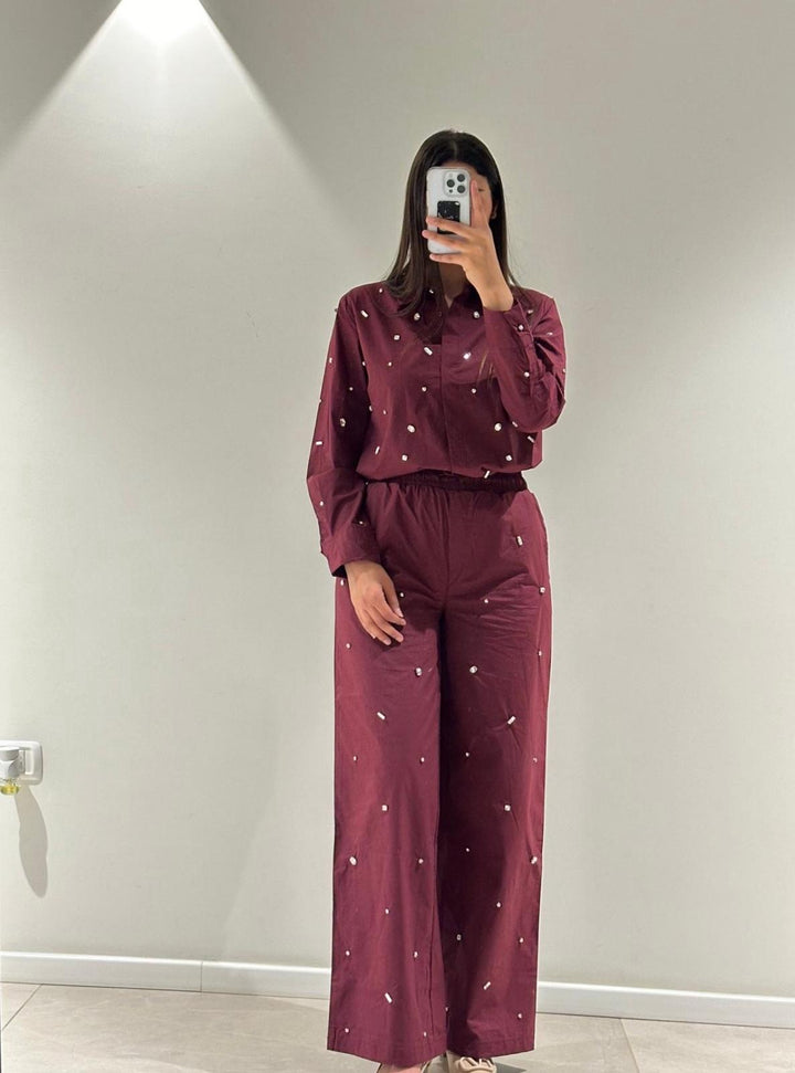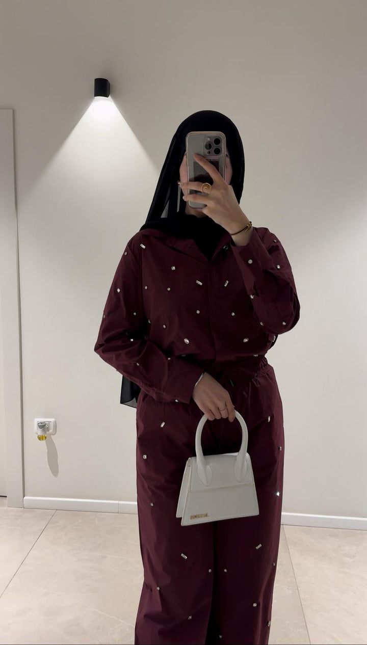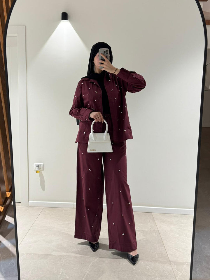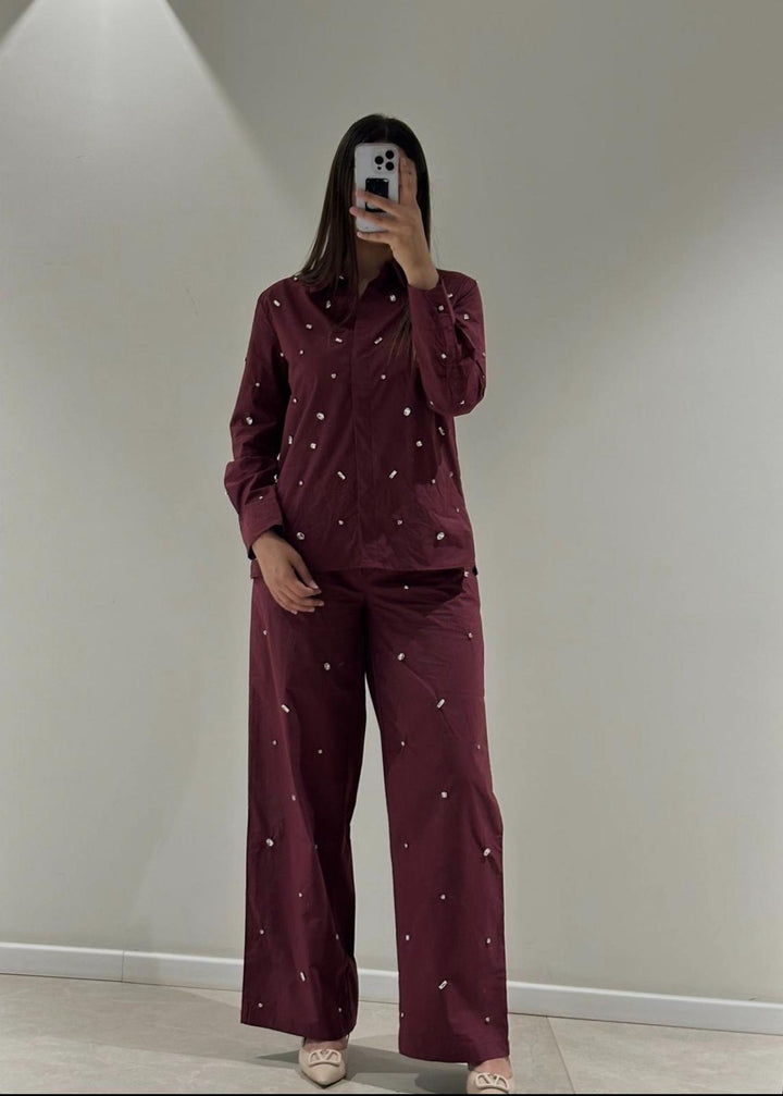 طقم قميص وبنطلون لون بوردو بقماش صيفي ثقيل مزيّن بحجار لامعة