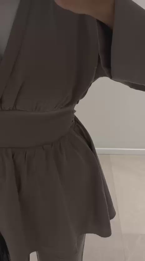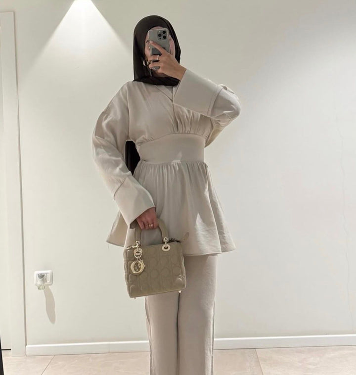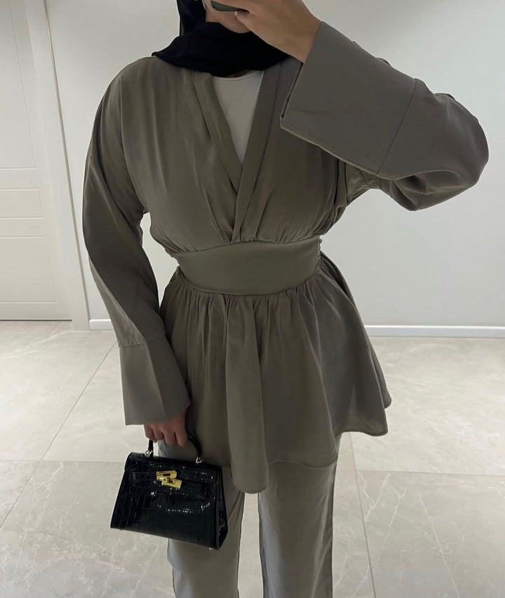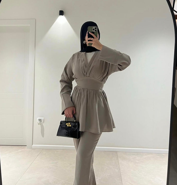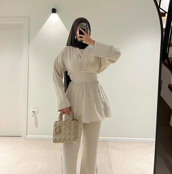 .زطقم بلوزة وبنطلون قماش صيفي مع ربطة من خلف الظهر مع تفصيلة خصر ضيق