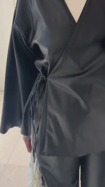 طقم بلوزة وبنطلون جلد مع تفاصيل ربطة للبلوزة من عند الخصر